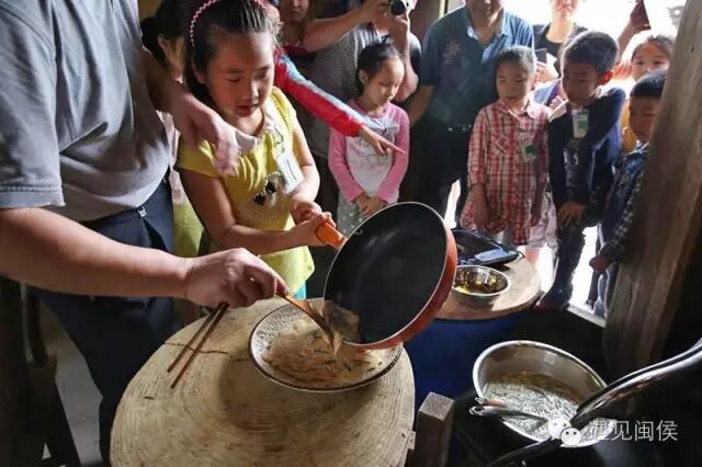 收割麦子后,孩子们又兴高采烈地到闽都民俗园农家大院品尝民俗小吃。在享用工作人员精心制作的豆浆、煎饼的同时,不少小朋友还亲手制作煎饼。